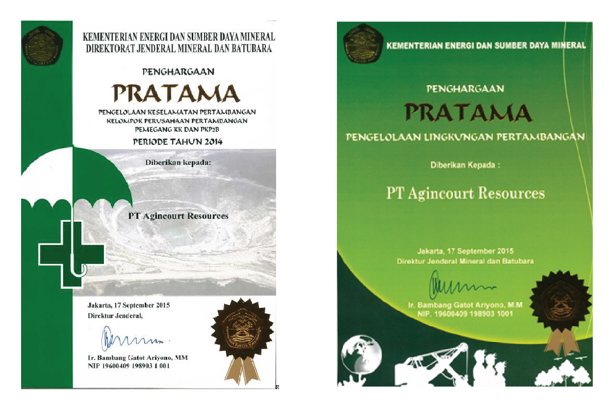 Martabe Gold Mine attained two Pratama (bronze) awards for the category of Contract of Work holder in Mining Environmental Management and Mining Safety Management from Directorate General of Mineral and Coal of Ministry of Energy and Mineral Resources.