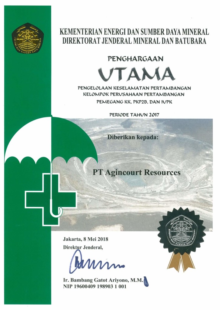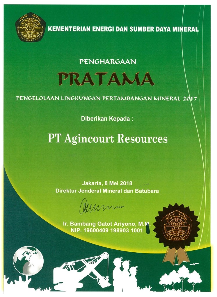 Martabe Gold Mine attained Utama (silver) award for the category of Contract of Work holder in Mining Safety Management and Pratama (bronze) award in Mining Environmental Management from Directorate General of Mineral and Coal of Ministry of Energy and Mineral Resources.