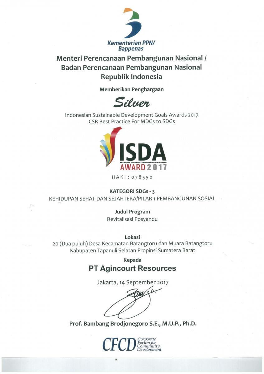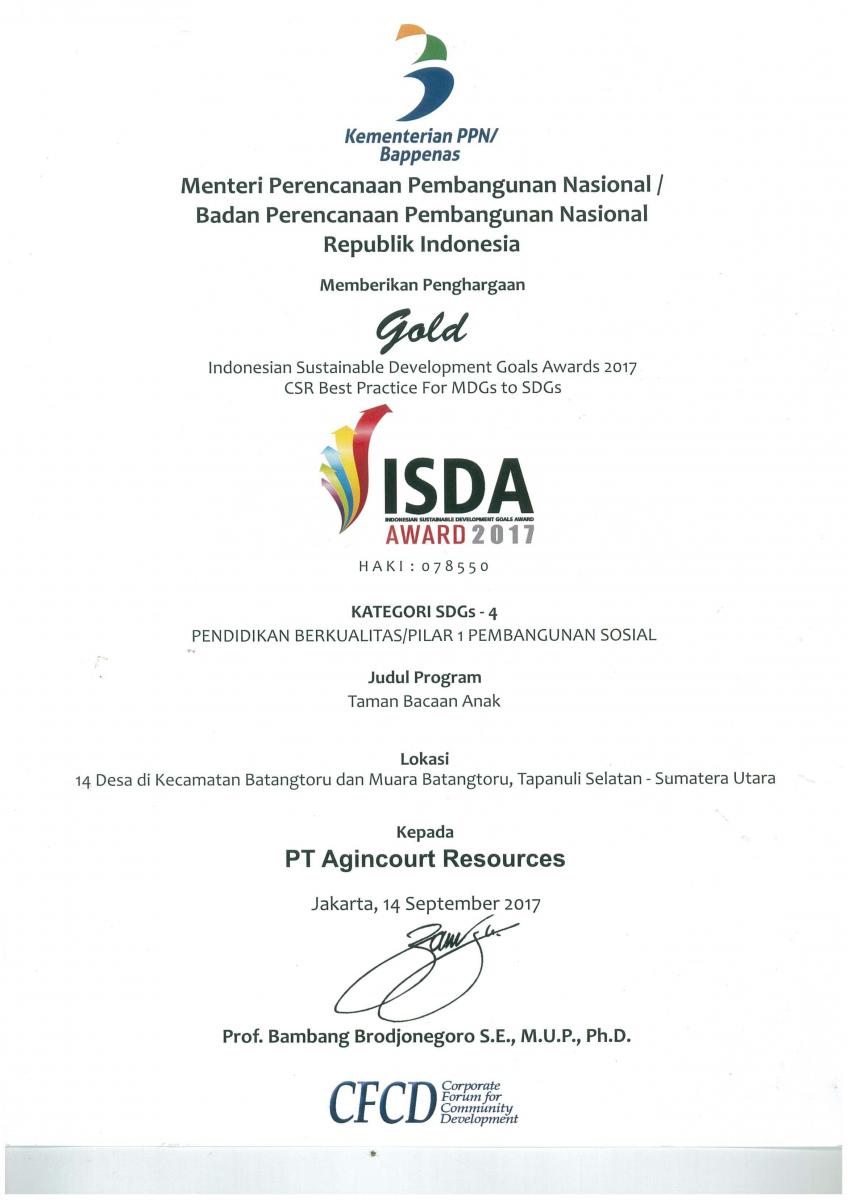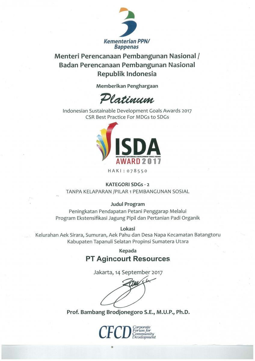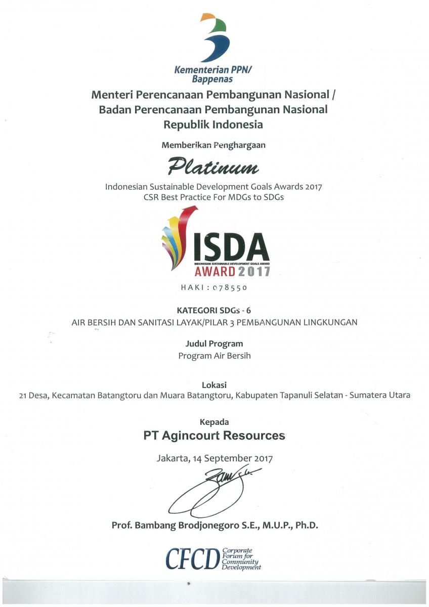 PT Agincourt Resources received seven awards for its sustainable community development programmes at the Indonesian Sustainable Development Goals Award (ISDA) 2017 event. The prestigious awards were given by Corporate Forum for Community Development (CFCD) supported by the Coordinating Ministry of National Development Planning (BAPPENAS). The seven recognition consisted of four platinum, one gold, and two silver awards. This year, Martabe Gold Mine is featuring its seven community development programmes in support of the United Nation’s Sustainable Development Goals (SDGs).
