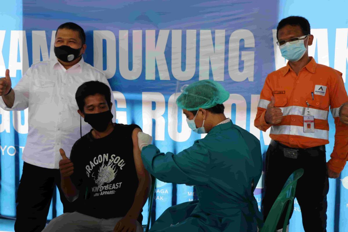 The second phase of the VGR program also received special attention from South Tapanuli District Head, Dolly P. Pasaribu and his staff. In addition, elements of the Southern Tapanuli Regional Leadership Communication Forum (Forkopimda), such as the Chief of South Tapanuli Police Command, AKBP Roman Smaradhana Elhaj, SIK and the Commander of Kodim (District Military Command) 0212/South Tapanuli, Lt. Col. INF Rooy Chandra Sihombing, SIP, also witnessed firsthand the implementation of the vaccination at the Martabe Gold Mine, Sunday (8/8).
