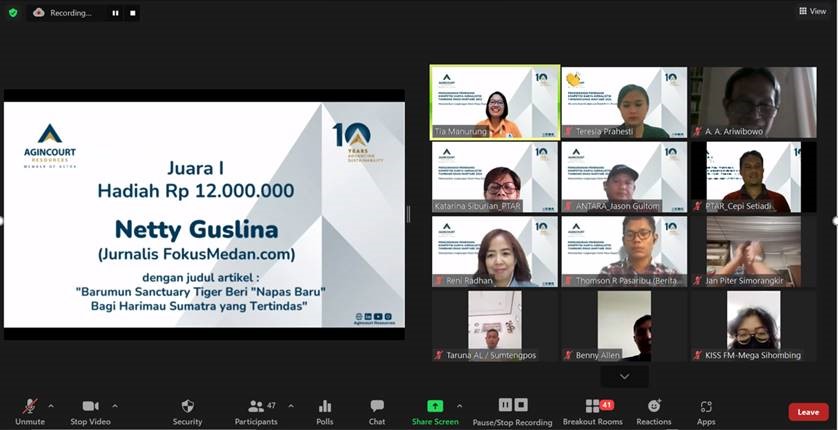 Batangtoru, 18 March 2022 – PT Agincourt Resources (PTAR), operator of the Martabe Gold Mine, announced the winners of the 2021 Martabe Gold Mine Journalistic Work competition with the theme Preserving the Environment for the Future in an online event held on Friday March 18, 2022. This the fifth competition was held for 23 journalists from South Tapanuli, Central Tapanuli, North Tapanuli and Medan, who submitted 30 journalistic works in the competition. This journalistic competition is intended to appreciate the mass media journalists in North Sumatra who have been supporting the Martabe Gold Mine operations through their journalistic works.
