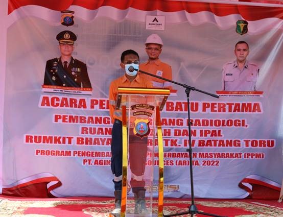Batangtoru, 19 May 2022 – PT Agincourt Resources (PTAR), operator of the Martabe Gold Mine, supported the construction of additional facilities of Level IV Bhayangkara Hospital in Batangtoru, South Tapanuli. This IDR 690,000,000 investment was for a Radiology Room, Morgue, and Wastewater Treatment Plant. Laying of the groundwork was carried out by PTAR General Manager Operations Rahmat Lubis, South Tapanuli Police Command Chief, AKBP Roman Smaradhana Elhaj, Head of Level IV Bhayangkara Hospital of Batangtoru, Dr Tommy Rivelino, Head of South Tapanuli Public Works Agency, and Chairul Rizal Lubis in Batangtoru, on Wednesday 18 May 2022.