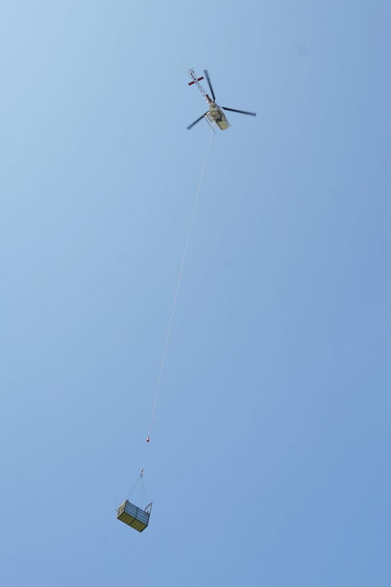 Sumatran tiger Surya Manggala, in the cage, was carried by an Agincourt Resources helicopter using the longline method.