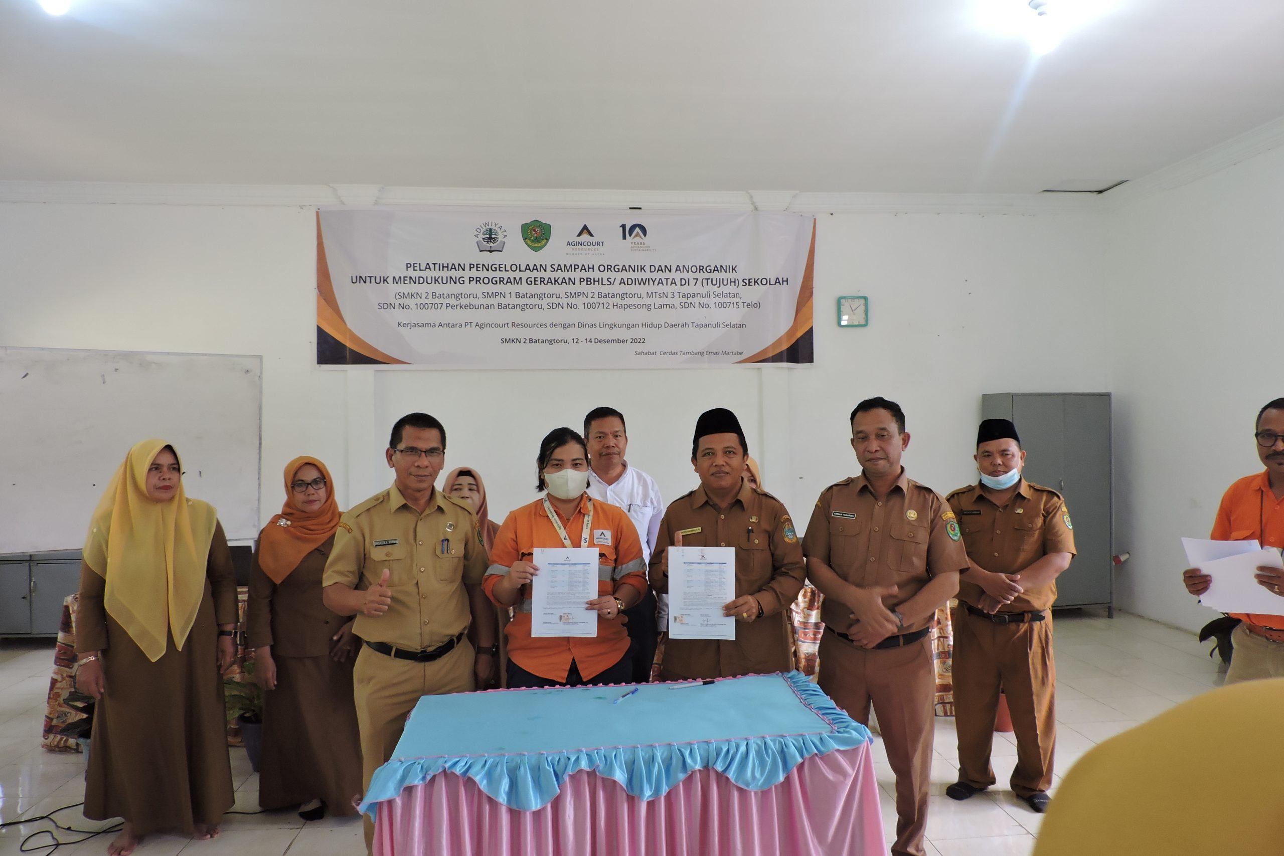 To improve the competence of school members (principals, Adiwiyata mentor teachers, and students) regarding how to manage waste, sort waste, count school waste piles, create waste banks, and make compost, PT Agincourt Resources (PTAR) cooperates with the Regional Environment Agency (DLHD) South Tapanuli held Organic and Inorganic Waste Management Training on Monday-Wednesday, 12-14 December 2022 at SMK Negeri 2 Batangtoru, Sipenggeng Village, Batangtoru Sub-District.