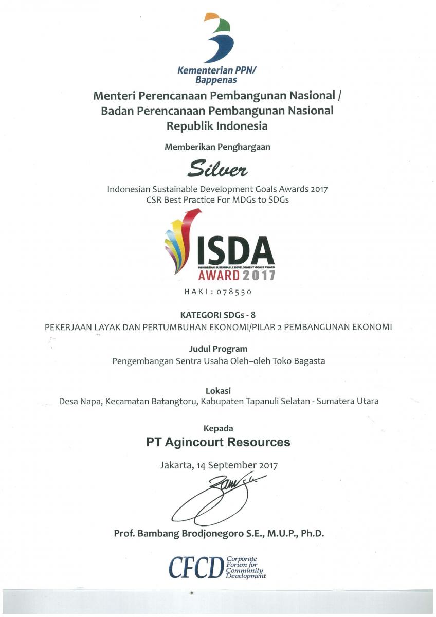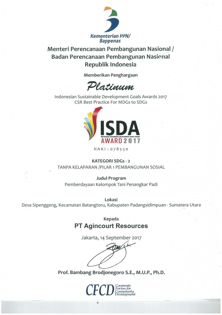 PT Agincourt Resources menerima tujuh penghargaan atas program-program pengembangan masyarakat dalam Indonesian Sustainable Development Goals Award (ISDA) 2017. Penghargaan bergengsi ini dipersembahkan oleh Corporate Forum for Community Development (CFCD) didukung oleh Kementerian Koordinator Perencanaan Pembangunan Nasional (BAPPENAS). Tujuh penghargaan terdiri dari empat platinum, satu emas, dan dua perak. Pada tahun ini Tambang Emas Martabe menominasikan tujuh program pengembangan masyarakat yang mendukung tercapainya Sasaran Pembangunan Berkelanjutan (Sustainable Development Goals) sebagai salah satu agenda PBB.