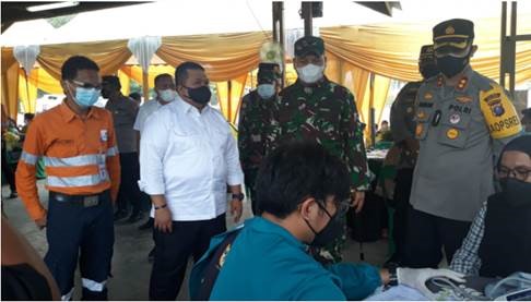 Foto 1: General Manager Operations PTAR, Rahmat Lubis, bersama Bupati Tapanuli Selatan, Dolly P. Pasaribu, Komandan Kodim 0212/ Tapanuli Selatan Letkol Inf Rooy Chandra Sihombing, SIP, serta Kapolres Tapanuli Selatan AKBP Roman Smaradhana Elhaj, SIK saat melakukan tinjauan langsung proses vaksinasi gotong royong tahap kedua di Tambang Emas Martabe, Minggu (8/8)