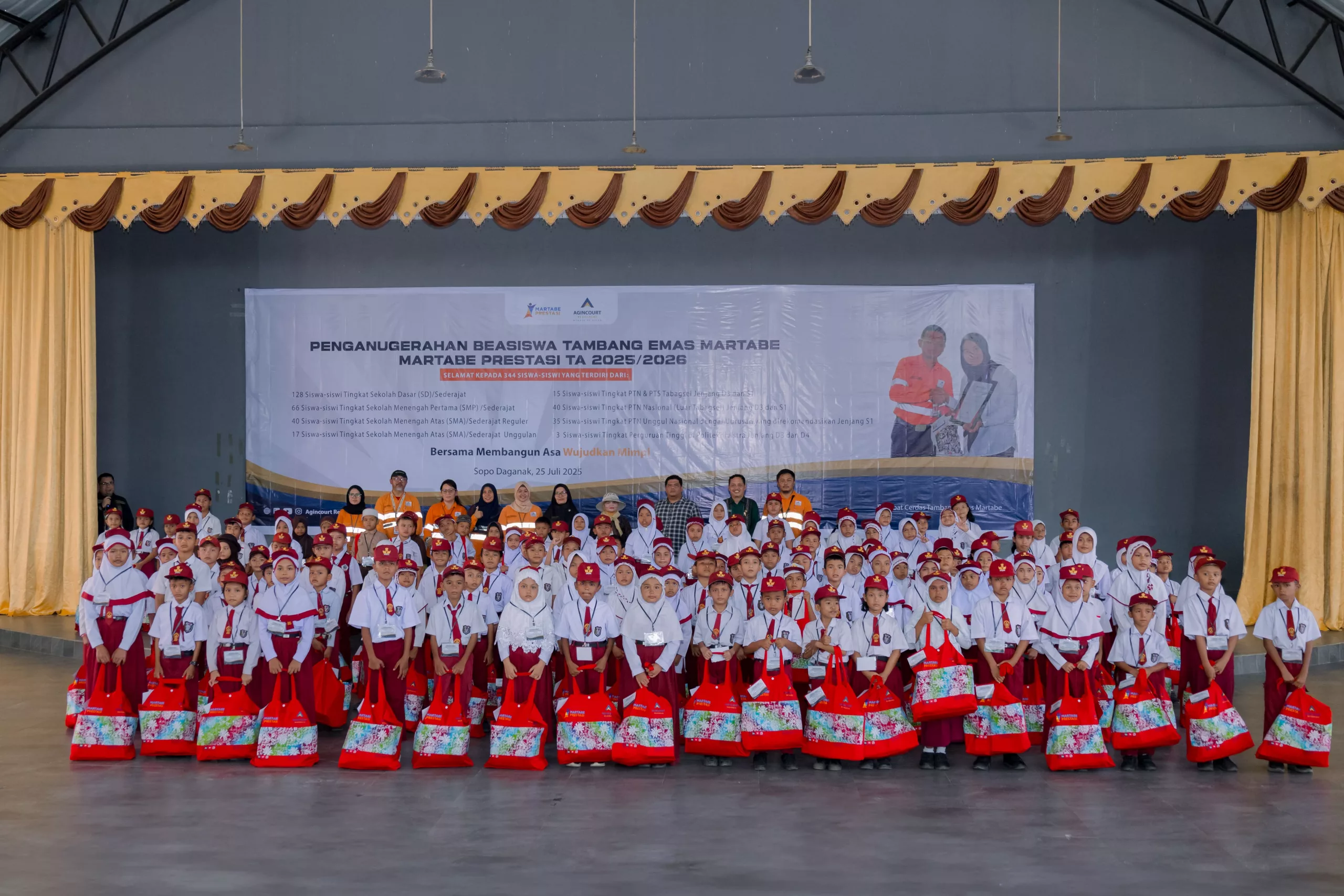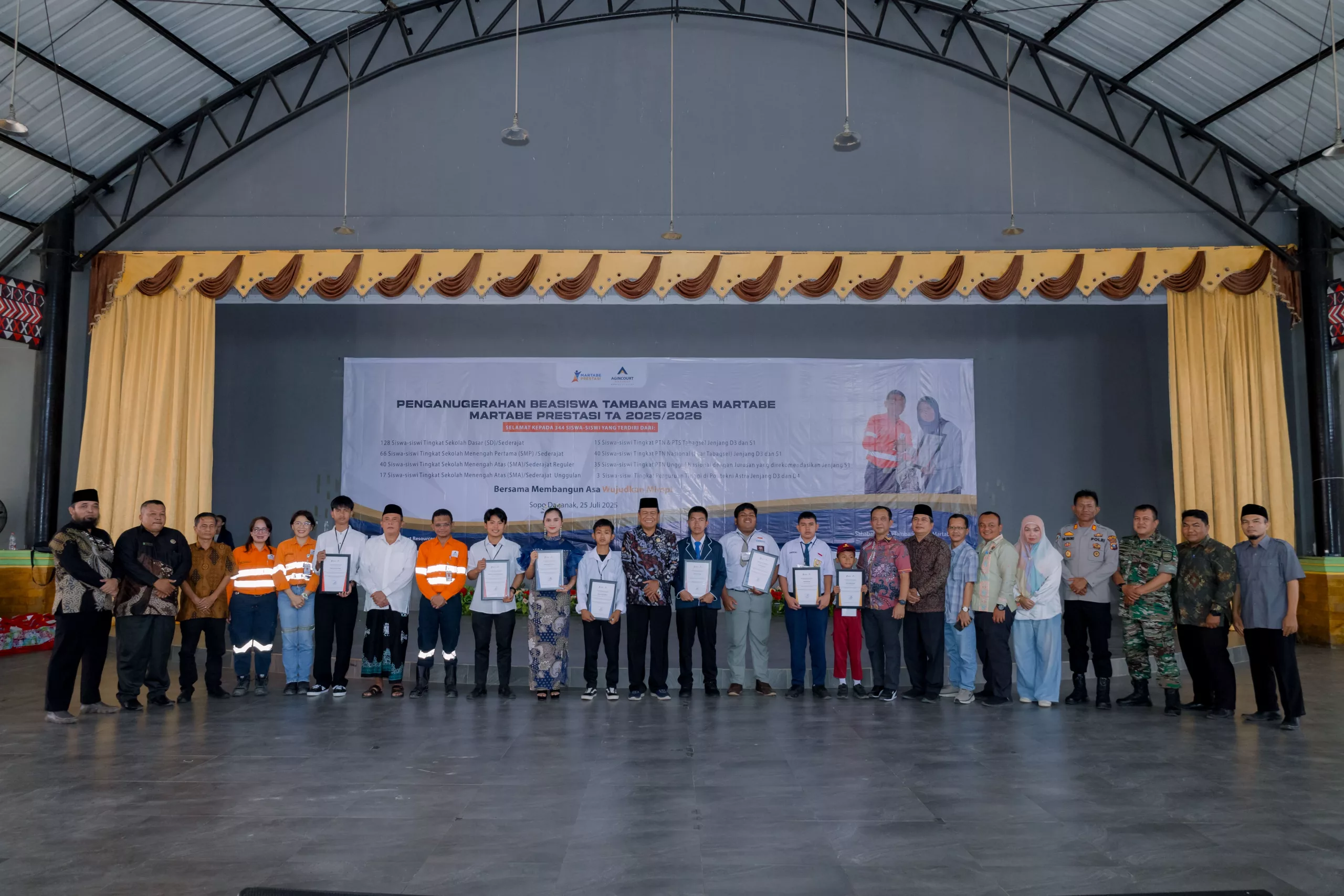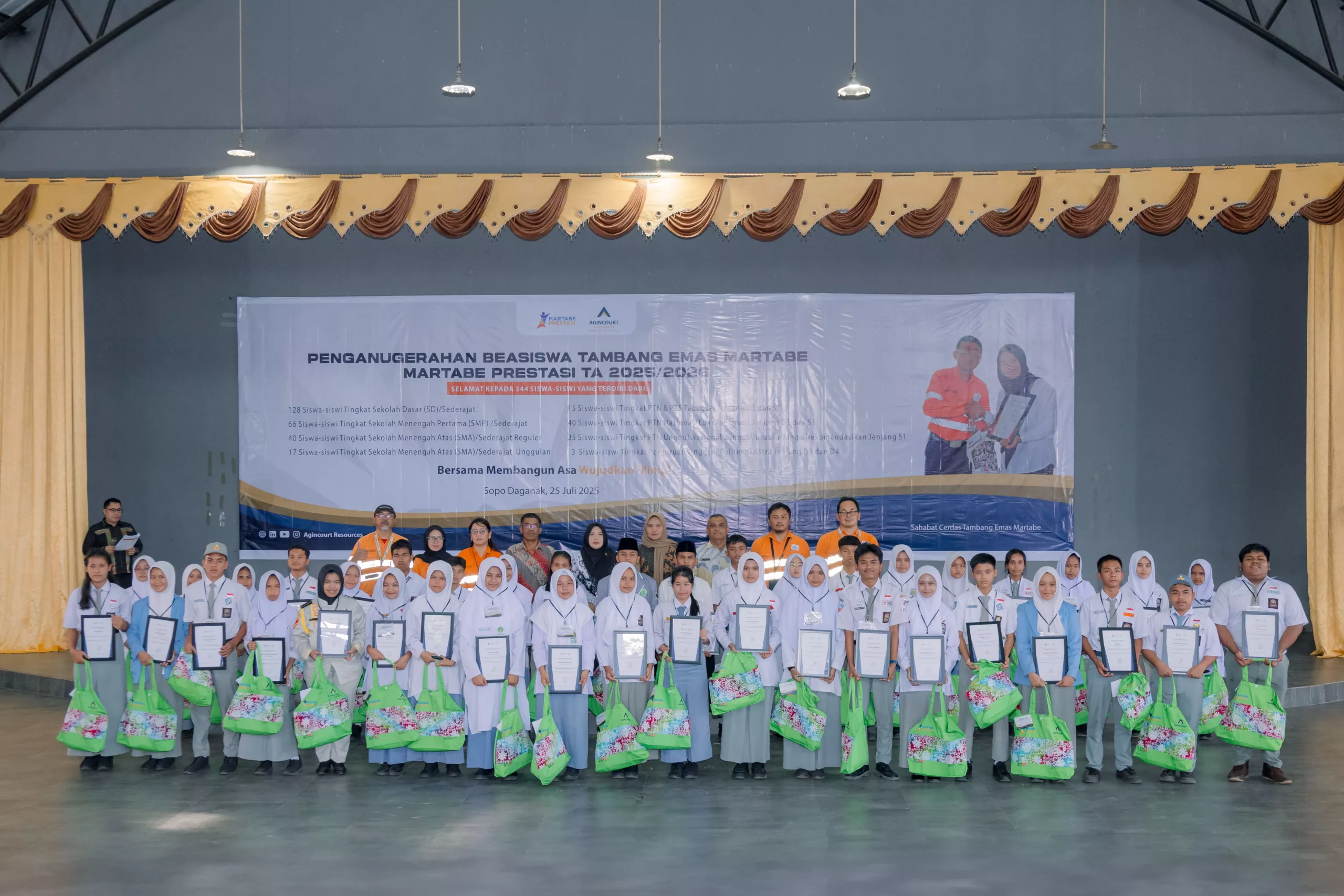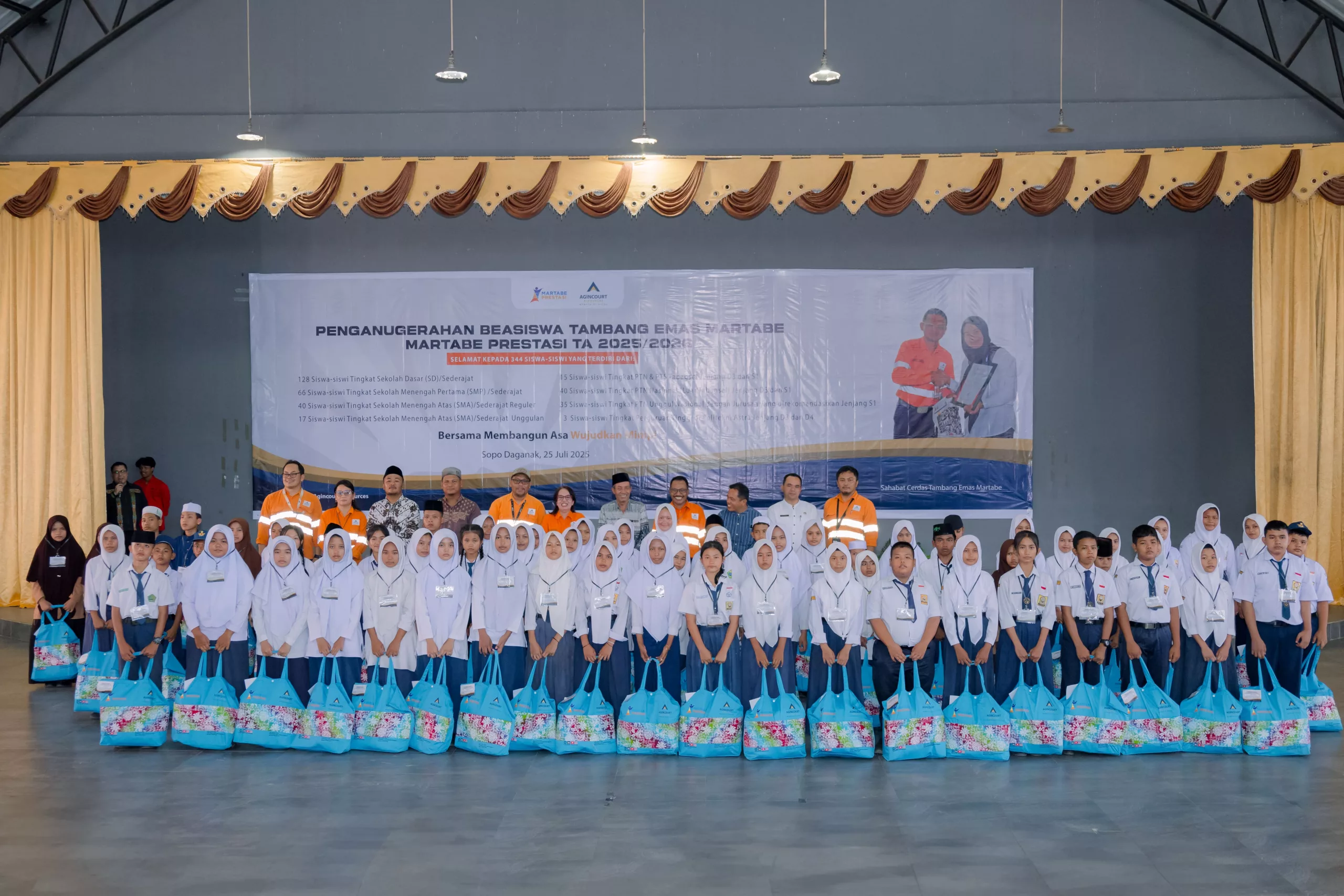 On Friday, 25 July 2025, Agincourt Resources held the Martabe Achievement Scholarship Award Ceremony for the 2025/2026 academic year at Sopo Daganak, Napa Village, Batang Toru Subdistrict. A total of IDR 5.97 billion in scholarship funds was disbursed to 569 students and university students from South Tapanuli and Padangsidimpuan, North Sumatra.